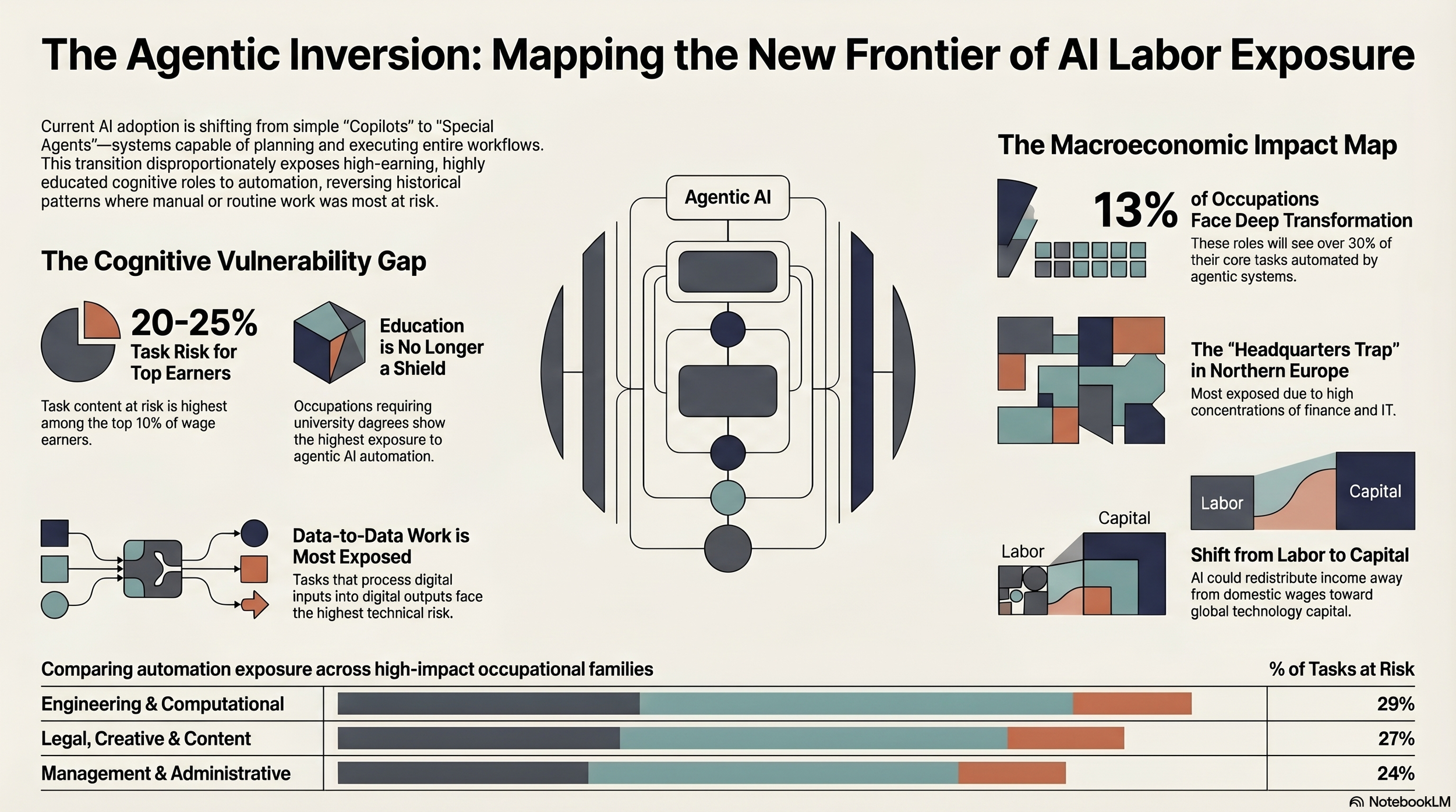 Consider a handful of numbers. One in eight occupations will have more than 30% of their tasks automatable by agentic AI in the coming years. Between 14% and 20% of all workforce tasks — depending on the country — could be automated. Among the highest-paid 10% of workers, 20 to 25% of their tasks are already in the crosshairs. And in engineering and computational roles, the single most exposed occupational family has a figure of 29%. These are not projections about robots on factory floors. They are projections about lawyers, analysts, engineers, and managers — the people who, until very recently, had every reason to feel secure.
