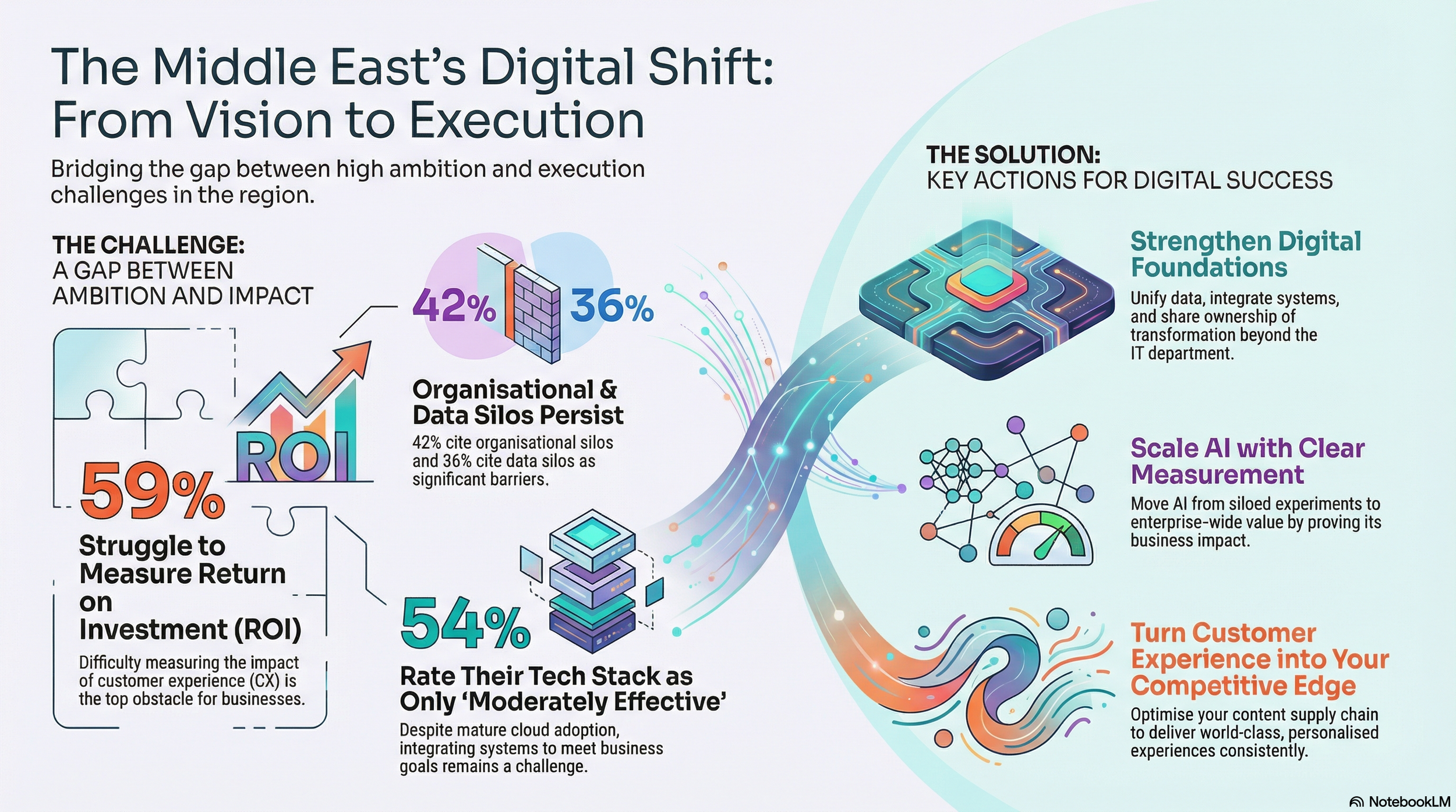 Based on a survey of 200 large enterprises across Saudi Arabia, the UAE, Egypt, Qatar, and Kuwait, the report paints a picture of momentum paired with friction. Cloud infrastructure is broadly in place, AI experimentation is widespread, and customer experience has become a board-level priority. Yet execution gaps, organisational silos, and weak measurement continue to dilute returns.